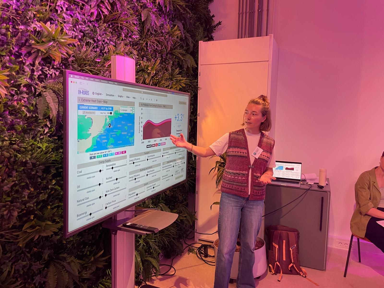 Deelnemers gingen aan de slag met de EN-ROADS klimaatsimulatie van MIT en mochten zelf de knoppen bedienen om de opwarming van de aarde te beperken tot 1,5˚C.
